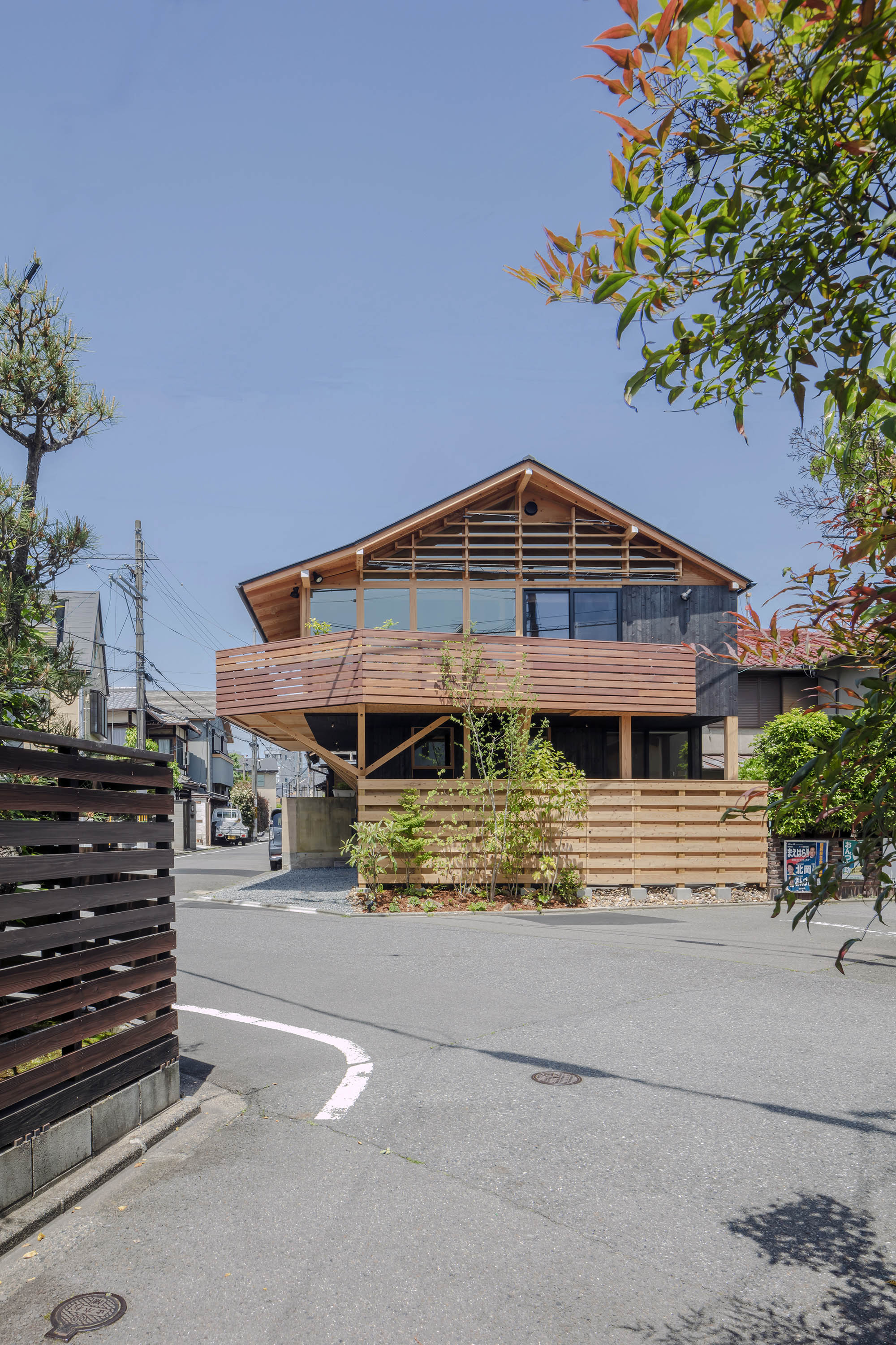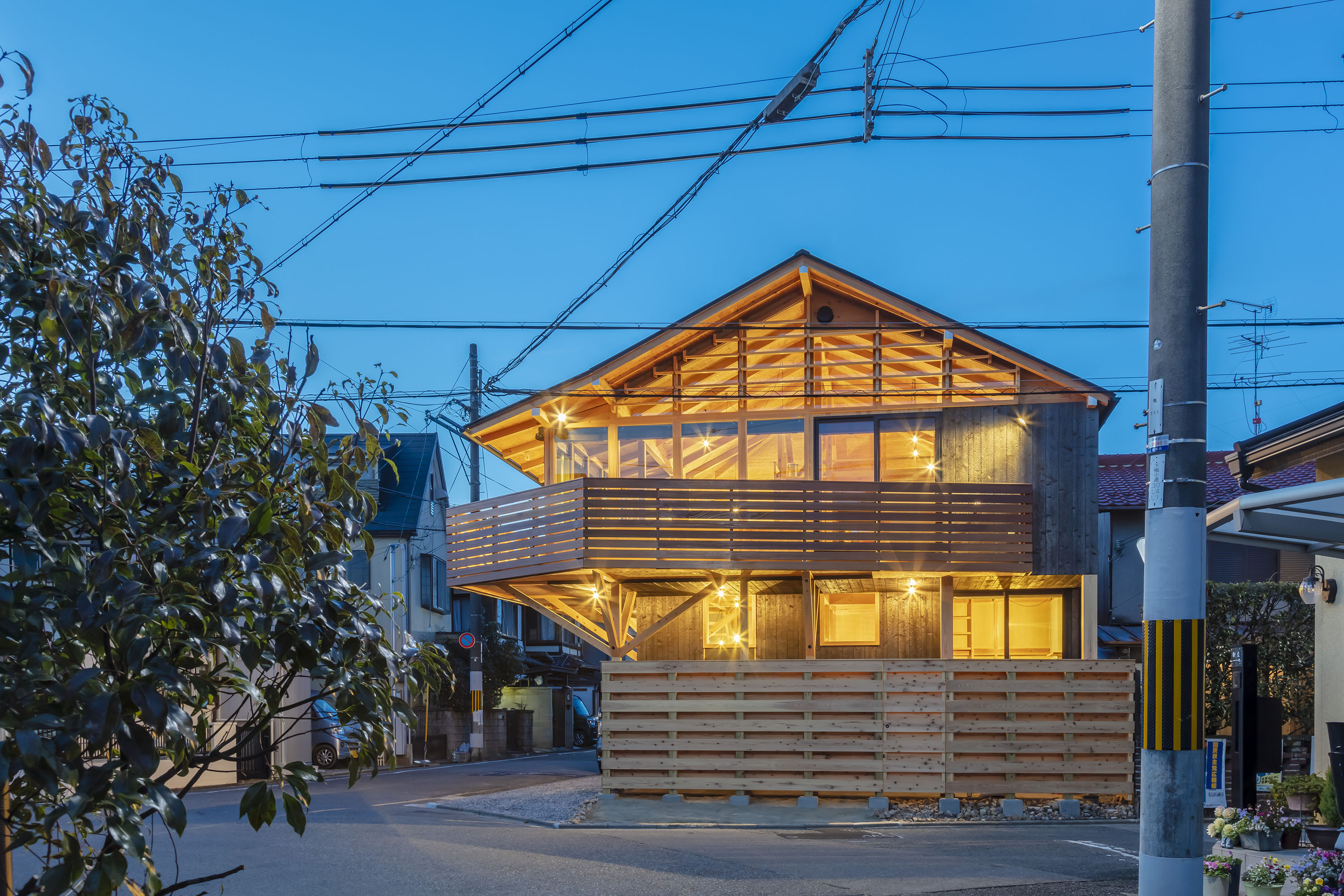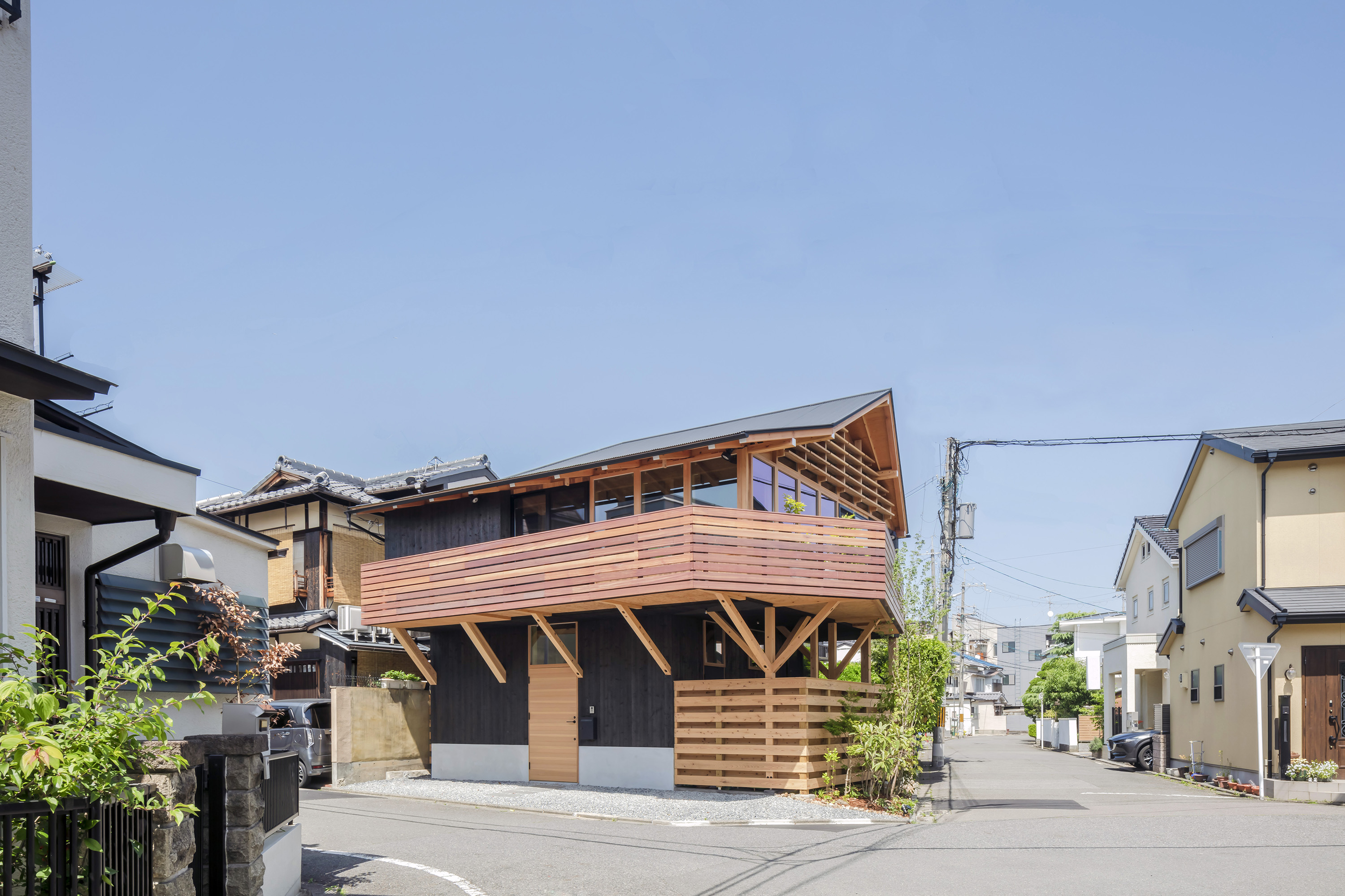 この地域は景観的理由から建物の形や大きさに京都市独特の厳しめの規制があり、また高額な地価からか周囲は道に沿って小さな敷地が連なり、ボリュームを抑えながら小さな家が込み合って立ち並んでいる。 H博士と探し当てた敷地も同様に小さいが、変形交差点の角地であり、この地域では局所的に公共空地空間である道路に大きく開き開放的であった。そこでこの開放性を活かし道路上の空間を視界に取り込む2階を5人で過ごすための広い居間として重点的に床を割り当て、建ぺい率の許す限り居間とベランダを設えている。交差点に開口を大きく設ける事で視線が道路上の空間を占有し、とても開放的な住まいとなった。 逆に1階は面積を絞り、道路からセットバックした壁面を設定し交差点の交通の安全性に配慮している。 また、前庭を設え、準防火地域にありながら様々な工夫により自然素材である木材を周囲に現す表情の仕上がりとする事で、地域の景観へ配慮しています
