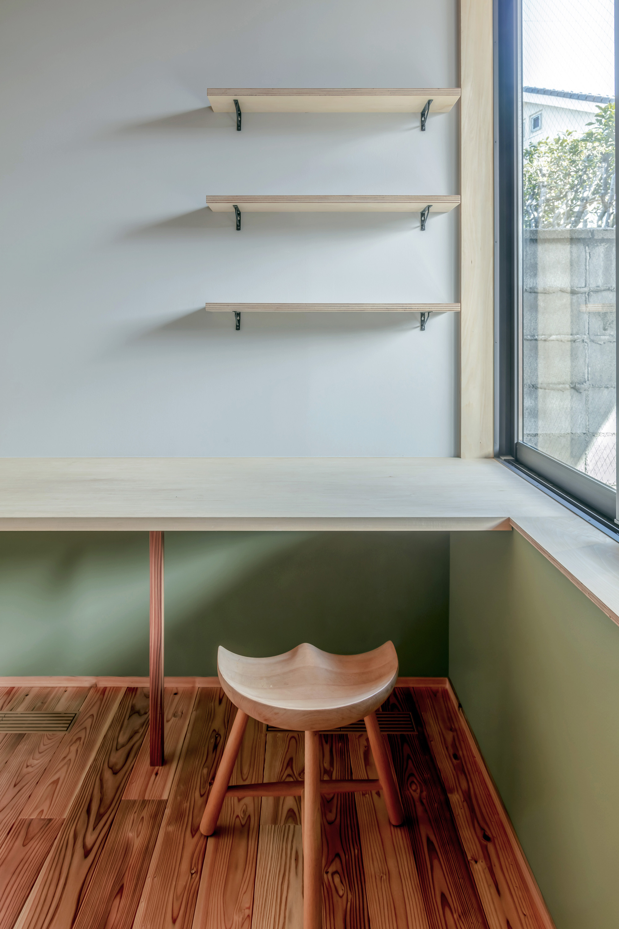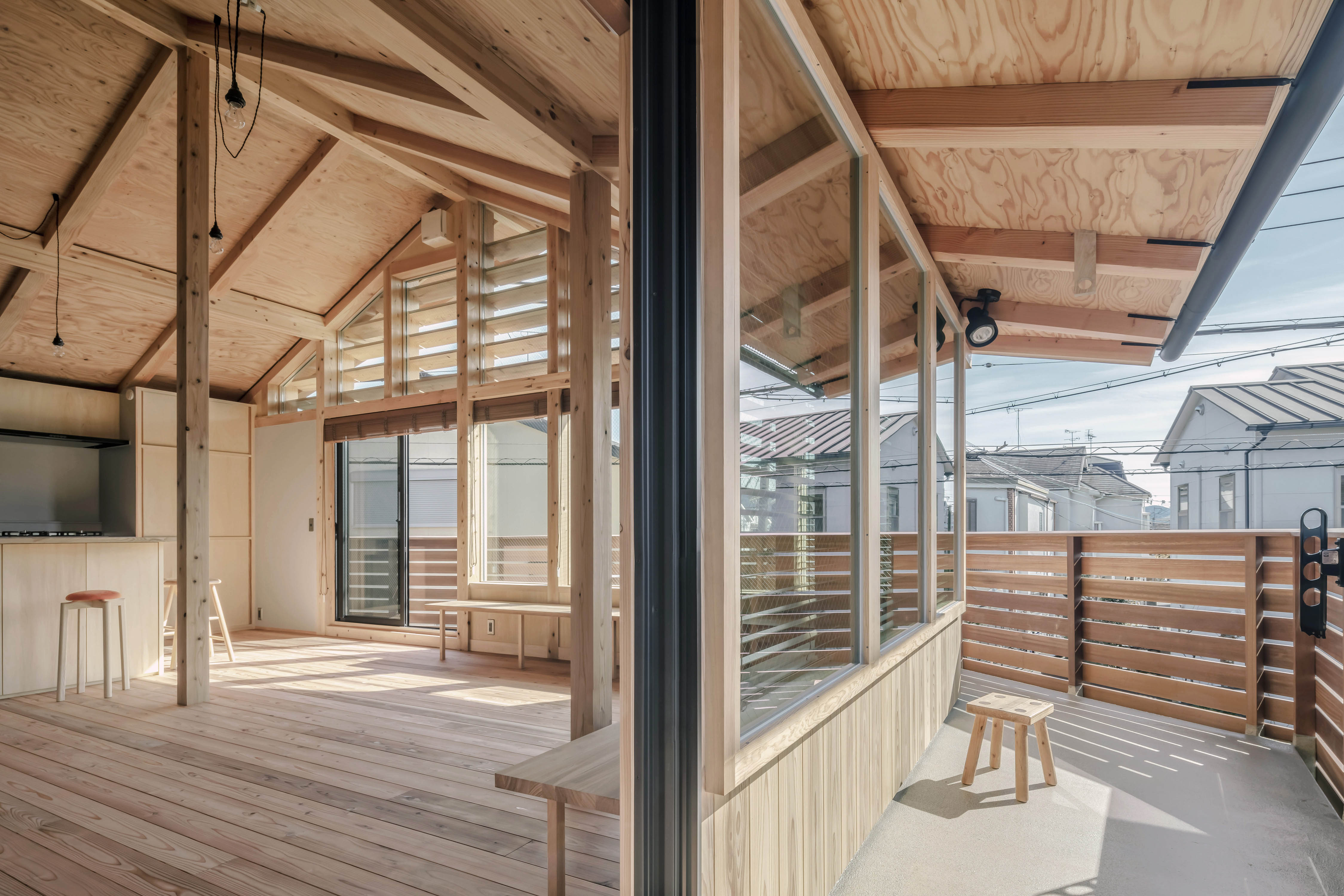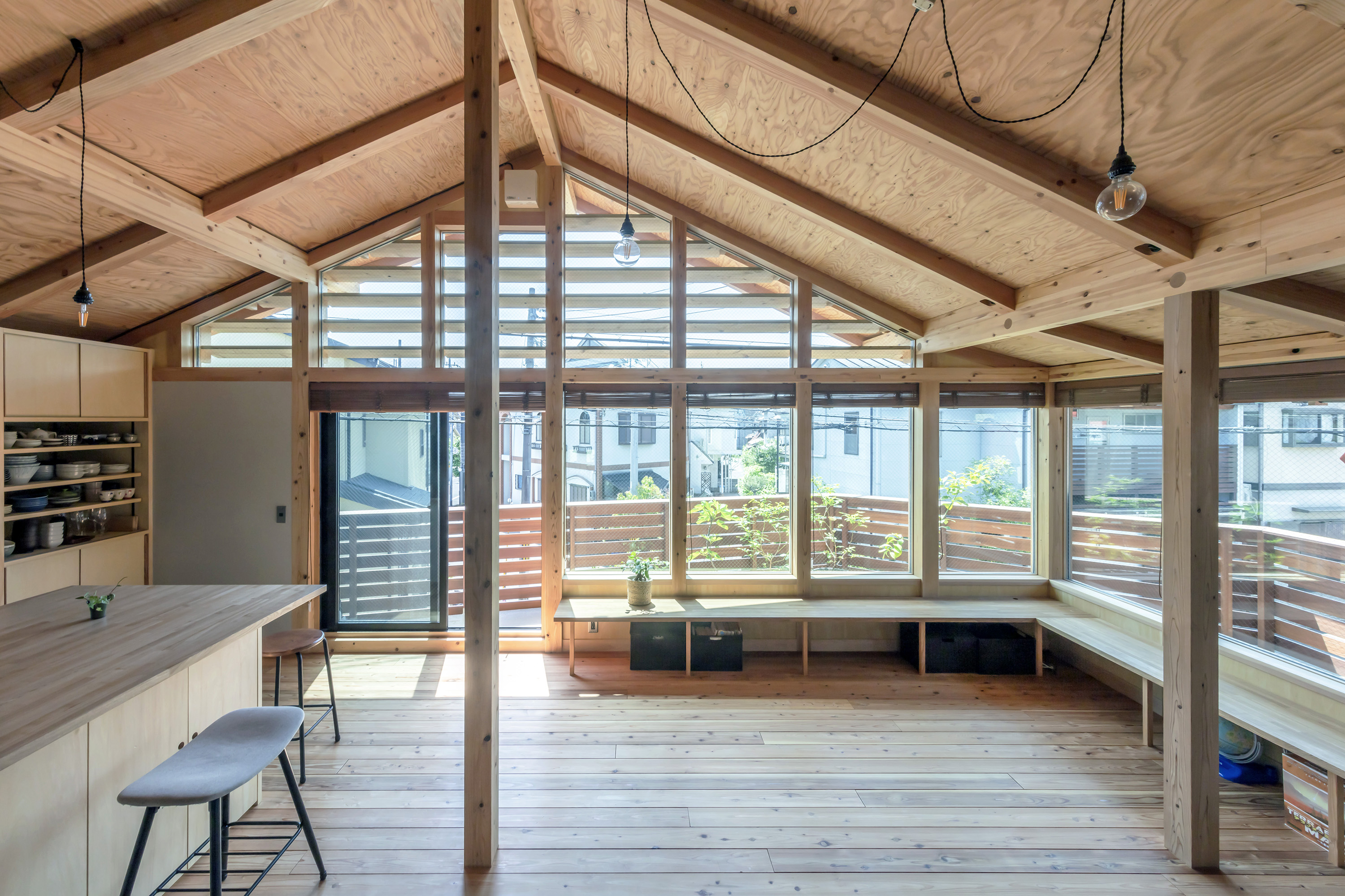 この地域は景観的理由から建物の形や大きさに京都市独特の厳しめの規制があり、また高額な地価からか周囲は道に沿って小さな敷地が連なり、ボリュームを抑えながら小さな家が込み合って立ち並んでいる。 H博士と探し当てた敷地も同様に小さいが、変形交差点の角地であり、この地域では局所的に公共空地空間である道路に大きく開き開放的であった。そこでこの開放性を活かし道路上の空間を視界に取り込む2階を5人で過ごすための広い居間として重点的に床を割り当て、建ぺい率の許す限り居間とベランダを設えている。交差点に開口を大きく設ける事で視線が道路上の空間を占有し、とても開放的な住まいとなった。 逆に1階は面積を絞り、道路からセットバックした壁面を設定し交差点の交通の安全性に配慮している。 また、前庭を設え、準防火地域にありながら様々な工夫により自然素材である木材を周囲に現す表情の仕上がりとする事で、地域の景観へ配慮しています