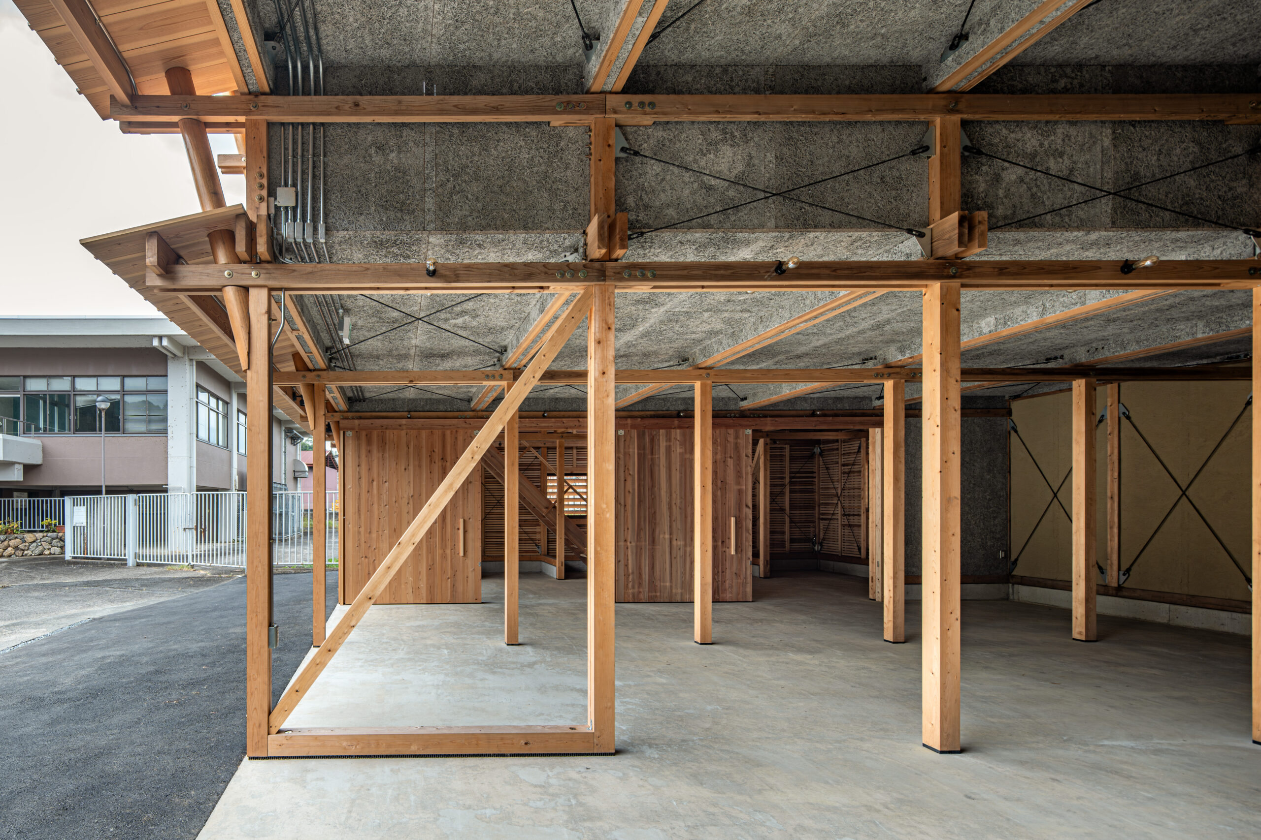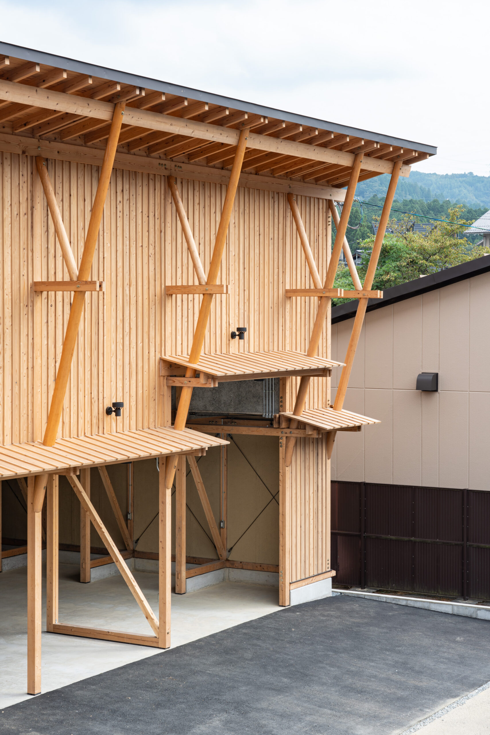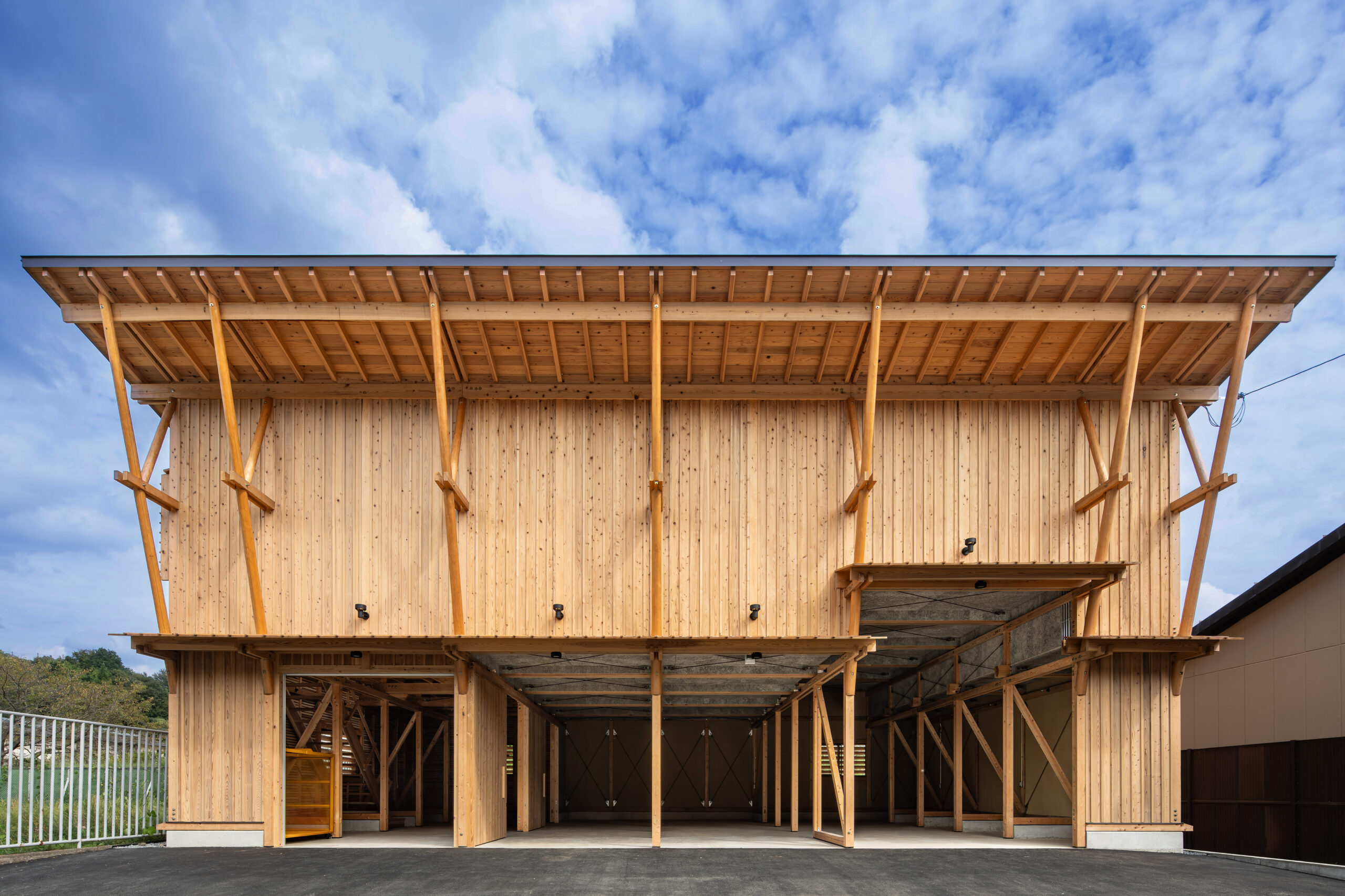 木材の供給は原木生産・乾燥・製材・仕上まで一貫生産が可能な京北森林組合が担当した。主な架構材料は組合倉庫に材料を見に行った時に発見した、木材倉庫に長く残る材を有効利用している。そこには6mを超える4寸角以上の立派な杉・ヒノキの平角が山と積み上げられていた。昨今ではプレカット装置に向かないこれらの材は在庫に残る傾向にある。 設計においてはチームの編成を考慮し、見つけた在庫の多種寸法に対応でき、学生大工でも比較的簡易な加工で行える「挟み梁工法」を採用している。 車庫に必要な有効寸法と木材特性を考慮し主なスパンは2850mm×2000mmとした。多雪地域である事、シンプルで施工しやすい架構とするため片流れ屋根としている。この際、通し柱とできる材の最長寸法が7000mmであった事から全体の高さを決定した。 車庫や資材倉庫の入口がある西側は大きな開口が並ぶため、雨除けの庇を1700mm出している。この庇を支える方杖が間口に印象的に7本並べている。この方杖は強度、対候性も必要な重要部の為、京都ブランド杉の磨き丸太を採用した。さらに高く建ちあがった2階西壁の耐風要素としてトラス構造としている。 この整然と並ぶ、トラス状の磨き丸太方杖のファサードが地域の景観として馴染み、地元を鼓舞しつづけて林業と大工をはじめ、山にかかわる人々を応援する存在となる事を期待している。