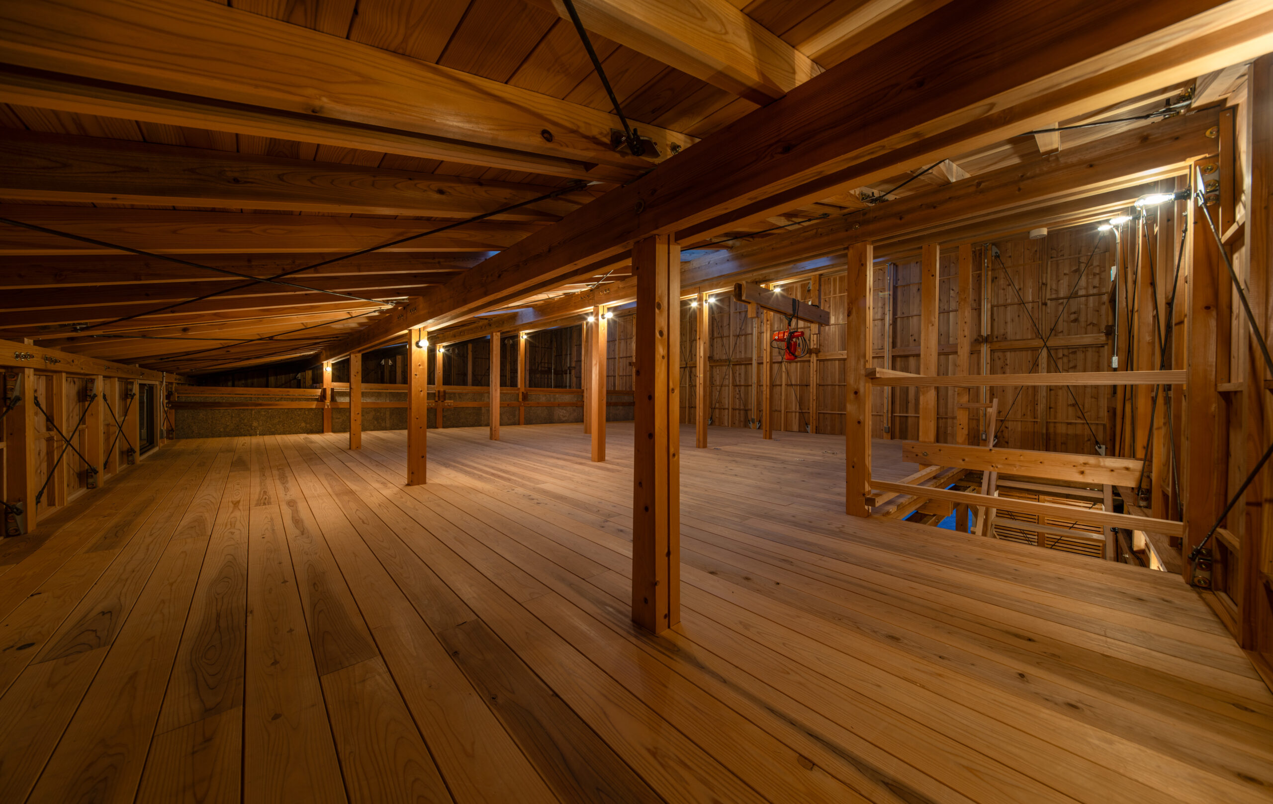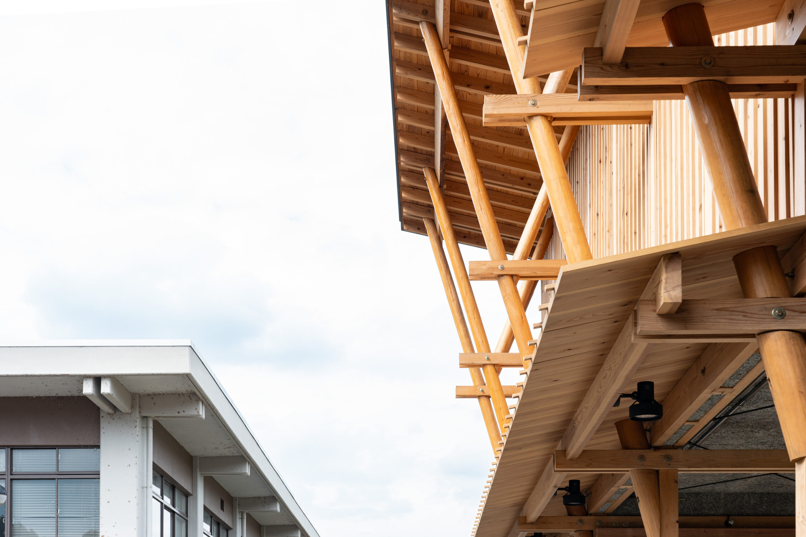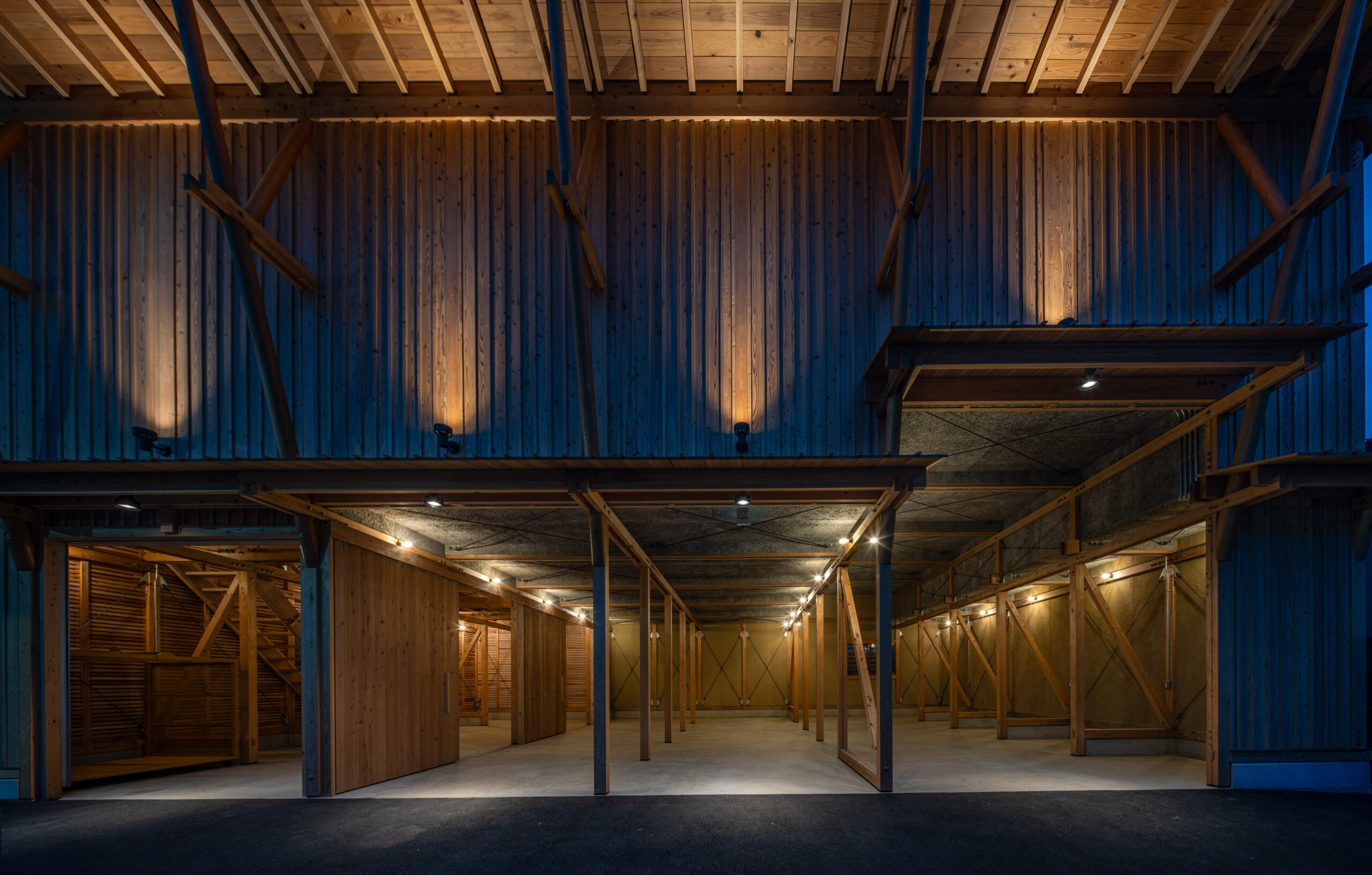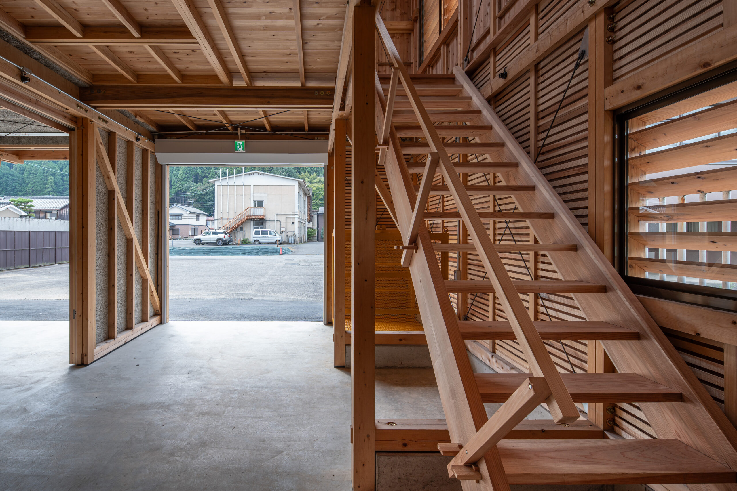 木材の供給は原木生産・乾燥・製材・仕上まで一貫生産が可能な京北森林組合が担当した。主な架構材料は組合倉庫に材料を見に行った時に発見した、木材倉庫に長く残る材を有効利用している。そこには6mを超える4寸角以上の立派な杉・ヒノキの平角が山と積み上げられていた。昨今ではプレカット装置に向かないこれらの材は在庫に残る傾向にある。 設計においてはチームの編成を考慮し、見つけた在庫の多種寸法に対応でき、学生大工でも比較的簡易な加工で行える「挟み梁工法」を採用している。 車庫に必要な有効寸法と木材特性を考慮し主なスパンは2850mm×2000mmとした。多雪地域である事、シンプルで施工しやすい架構とするため片流れ屋根としている。この際、通し柱とできる材の最長寸法が7000mmであった事から全体の高さを決定した。 車庫や資材倉庫の入口がある西側は大きな開口が並ぶため、雨除けの庇を1700mm出している。この庇を支える方杖が間口に印象的に7本並べている。この方杖は強度、対候性も必要な重要部の為、京都ブランド杉の磨き丸太を採用した。さらに高く建ちあがった2階西壁の耐風要素としてトラス構造としている。 この整然と並ぶ、トラス状の磨き丸太方杖のファサードが地域の景観として馴染み、地元を鼓舞しつづけて林業と大工をはじめ、山にかかわる人々を応援する存在となる事を期待している。