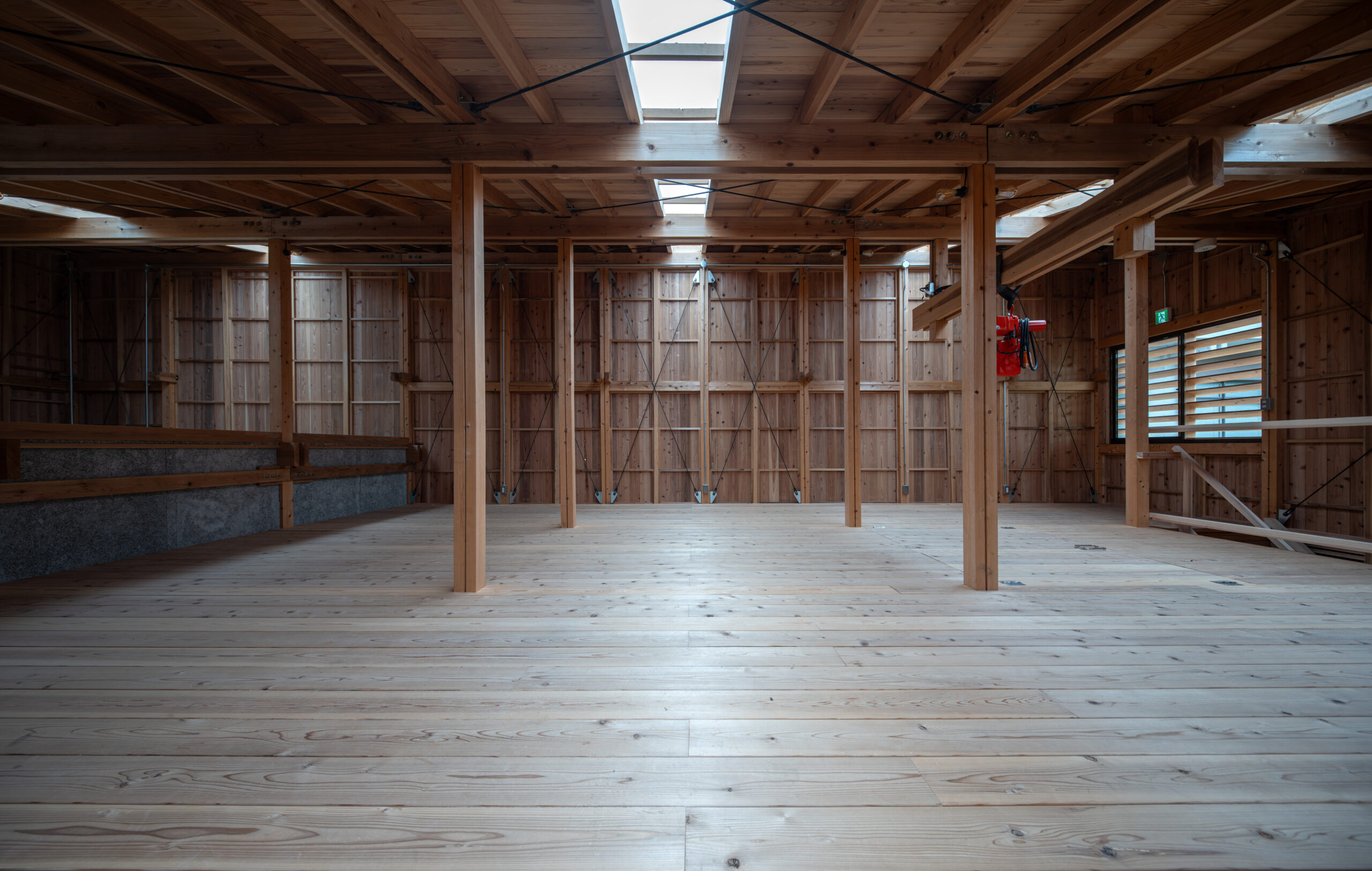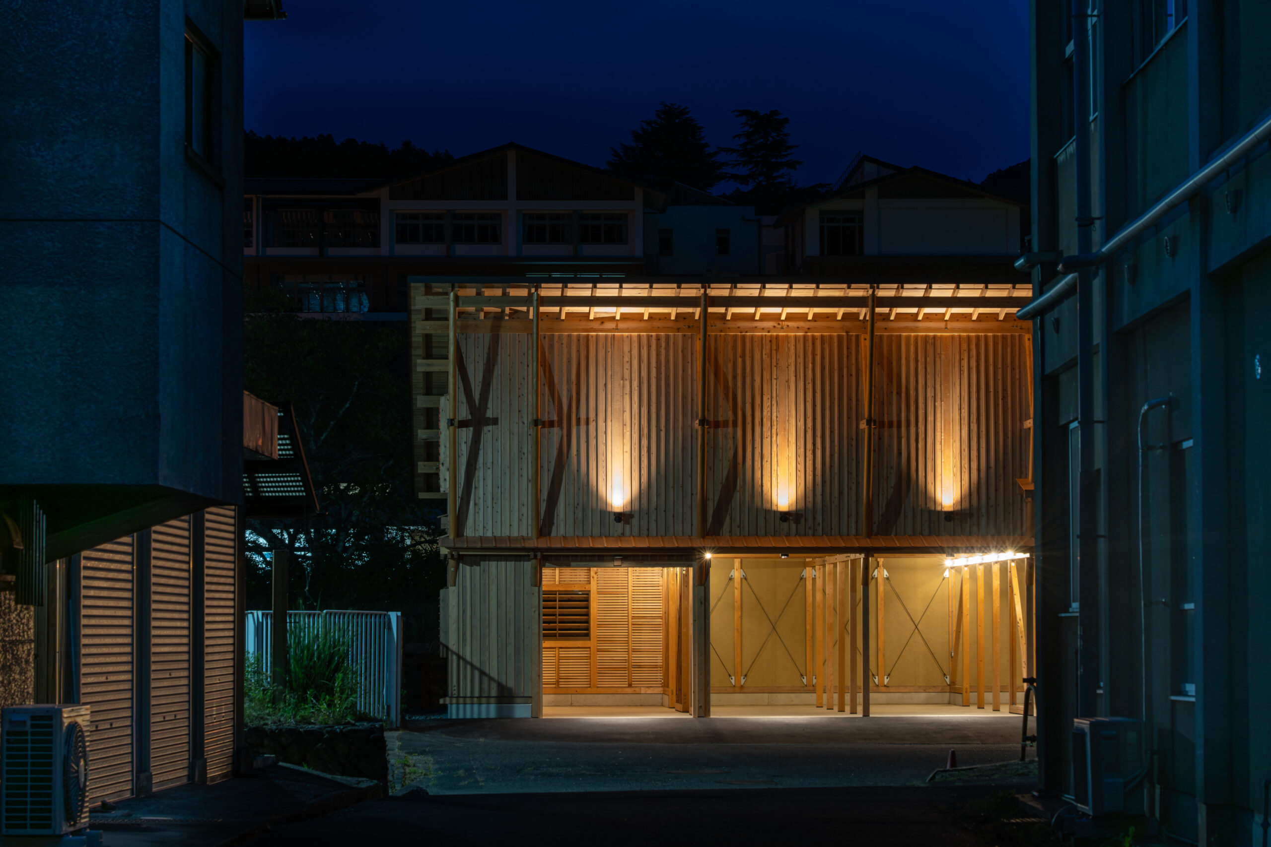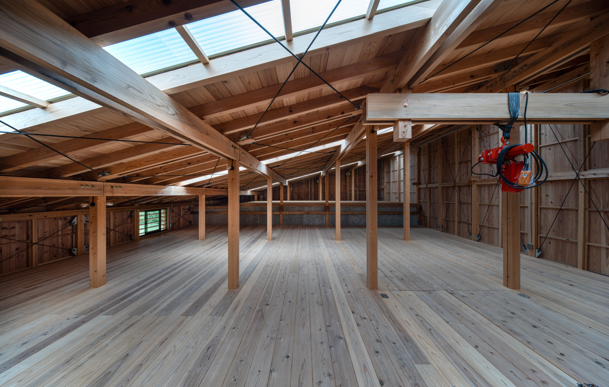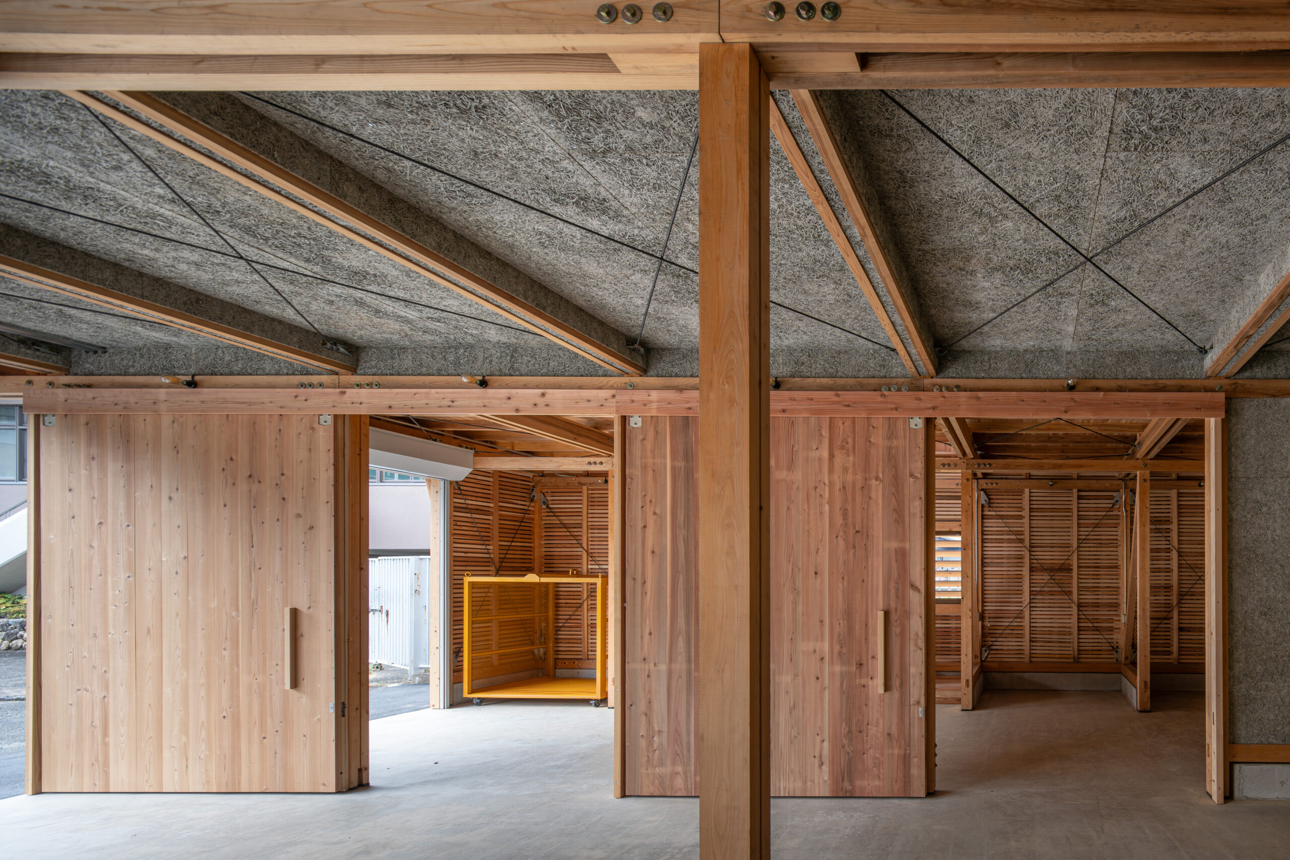 京北森林組合の林業施業の為の資材倉庫と車庫の計画である。この計画は、京北地域で生産・製材された木材を媒介とした山の価値の循環促進、また将来京北の木材を使うであろう大工の卵たちへの意識と技術の継承、京北周山地域の修景も目的としても計画された。 京北は平安京の時代から「御杣御料地」として建築用材を送り出す地域として伝統を引き継ぎながら発展してきた。当初計画は、既存の古い軽量鉄骨とスレート葺きの車庫と同様仕様の建替え予定であったものを、林業のまちの森林組合の施設は自らが生産した木材による意味ある建築とべきとの考えから組合内で話し合いを重られ今回の計画ですすめられた。 倉庫づくりの体制としては、施工は地元の大工棟梁の工務店が請負い、大工工事のサポートとして「大工の卵たち」である京都市内の建築専門学校大工チームが木工研修として担当し、手刻みから建て方、造作工事を行っている。